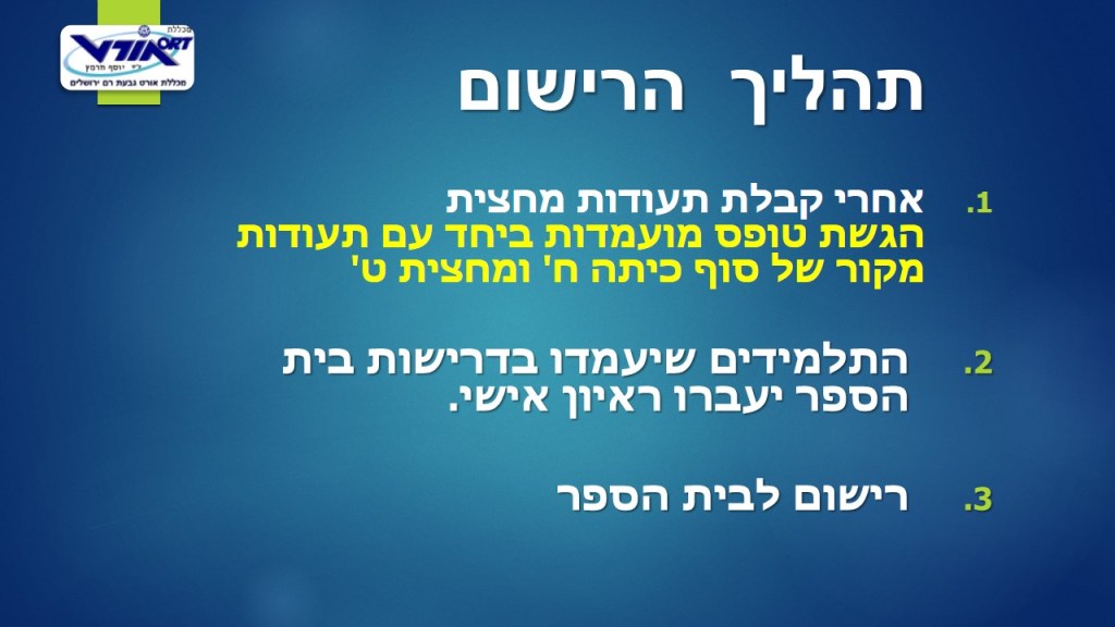 תהליך רישום לתיכון לבוגרי כיתות ט' שעולים לכיתה י' להורדה: טופס מועמדות לעולים לכיתה י לשאלות אפשר ליצור קשר למספרי הטלפון: 026754606 – 026754604 – 026754673 לדף הבית – HOME תיכון – מסלולים ומגמות לשתף לשתף ב-X (נפתח בחלון חדש) X שתף בפייסבוק (נפתח בחלון חדש) פייסבוק אהבתי טוען...