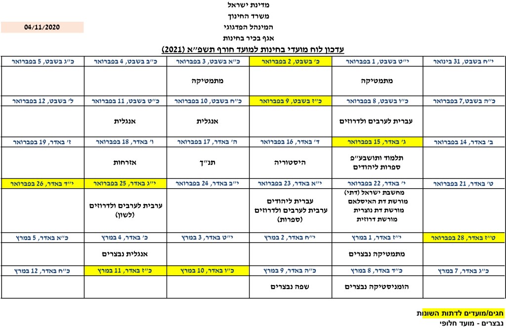 השבוע פרסם משרד החינוך מועדים חדשים לבגרויות חורף לתלמידי י"א ו י"ב. אנחנו מקווים שזה לוח סופי אבל אנחנו יודעים שחוסר היציבות שמאפיין את התקופה הזאת והתלות הישירה במצב התחלואה בארץ עלולים להביא לשינויים נוספים.