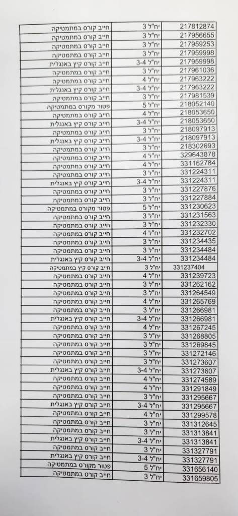 לרשימת התלמידים המחויבים בקורסים : **שימו לב , תלמידים שלא מופיעים בקורסי קיץ באנגלית, לא צריכים לעשות קורס קיץ במקצוע זה, וכן הודעה על חלוקה ליחידות באנגלית עבורם, תתפרסם בהמשך