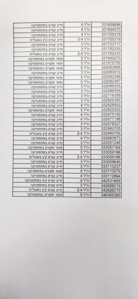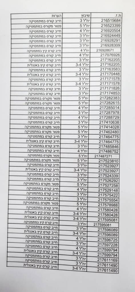 לפניכם קובץ עם רשימת תלמידי כיתות י' לפי מספרי תעודת זהות ושיבוץ לרמות מתמטיקה ואנגלית. כדי לראות את הקובץ יש ללחוץ על הכפתור "הורד":